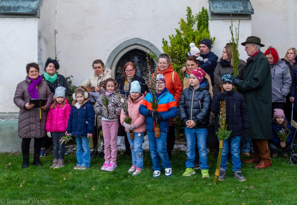 Im folgenden Festgottesdienst bildeten die Texte der beiden Lesungen sowie der Passion Jesu einen bedeutenden Schwerpunkt, denn die Höhrerinnen und Höhrer wurden dadurch zur großen Leidensgeschichte am Karfreitag hingeführt, eine Verbindung dieser beiden Tage somit hergestellt. Nach dem Tagesgebet las Herr Michael Kotominsky die 1. Lesung, Jes 50, 4-7, das sog. 3. Lied vom Gottesknecht, gefolgt von Frau Maria Ferk mit der 2. Lesung, Phil 2, 6-11. Daran anschließend war die Passion Christi gemäß dem Lesejahr A nach dem Evangelisten Matthäus (Mt 26, 14 – 27, 66) zu hören, jedoch in einer Kurzfassung ab dem Verhör vor Pilatus (Mt 27, 11-54). Herr Kotominsky übernahm den Evangelistenpart, die Jesusworte Pfarrer Mosser und die Worte der übrigen Personen wurden von Herrn Hannes Quendler vorgetragen. Einer anschließenden kurzen Predigt, dem Glaubensbekenntnis sowie den Fürbitten, gelesen von Herrn Kotominsky, folgend, begann die Eucharistiefeier mit der Gabenbereitung. Beim Vaterunser stand der Pfarrer mit den Ministranten und einigen Kindern, einander die Hände reichend, in einem Halbkreis um den Volksaltar. Nach der Kommunionspendung trug Frau Ferk die Worte der Geistlichen Kommunion vor. Abschließend folgte ein gestischer Gesang insbesondere um den Volksaltar zu dem Organistin und Chorleiterin Frau Theresia Feistritzer besonders die Kinder eingeladen hatte. Diesen begleitete Frau Evelyn Winkler auf der Gitarre.