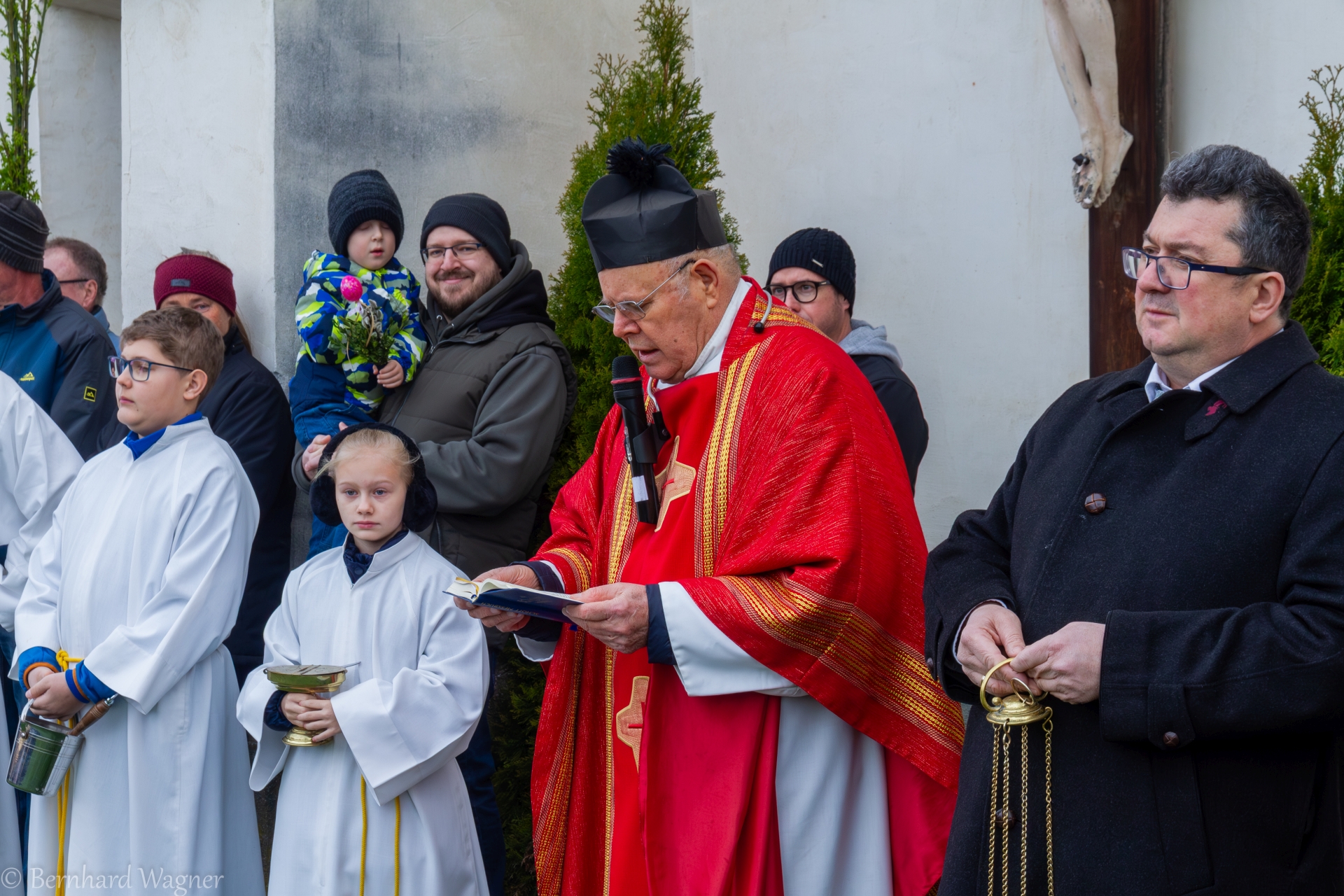 Gemeinsam mit zahlreichen anwesenden Gläubigen feierte Pfarrer KR Mag. Helmut Mosser einerseits den Einzug Jesu in Jerusalem und andererseits sein Leiden und Sterben. Dieser Kontrast, welcher sich ja auch im vollständigen Namen des Palmsonntags abbildet, führt uns dann durch die Karwoche hin bis zur Kulmination am Karfreitag, stellt also von Anfang an schon eine Art Brücke hin zu den Ereignissen am Karfreitag dar.