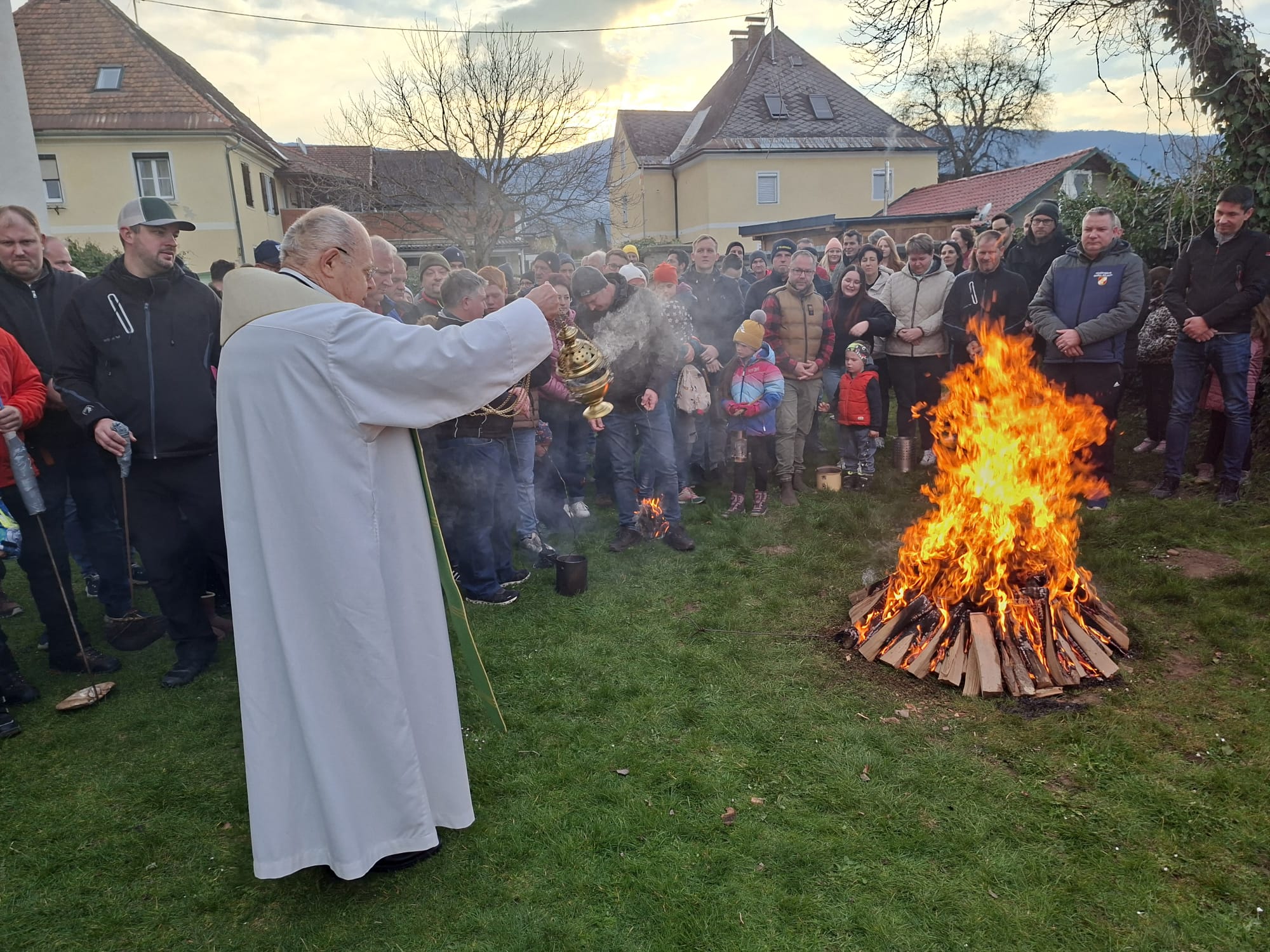 Am Karsamstagmorgen, im Jahr 2026 der 4. April, begann traditionell um 7.00 Uhr früh beim sog. Missionskreuz auf der Wiese vor der Pfarrkirche Maria Rojach die von Pfarrer KR Mag. Helmut Mosser vorgenommene Feuerweihe zu der auch aufgrund des schönen Wetters wieder zahlreiche Gläubige gekommen sind.